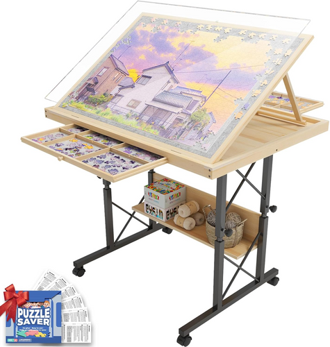 Easyego 1500 Piece Jigsaw Puzzle Table with Legs for Adults, Adjustable Puzzle Table with Draws, Wooden Puzzle Board with Extended Support Bar & 4 Wheels(Light Gray)