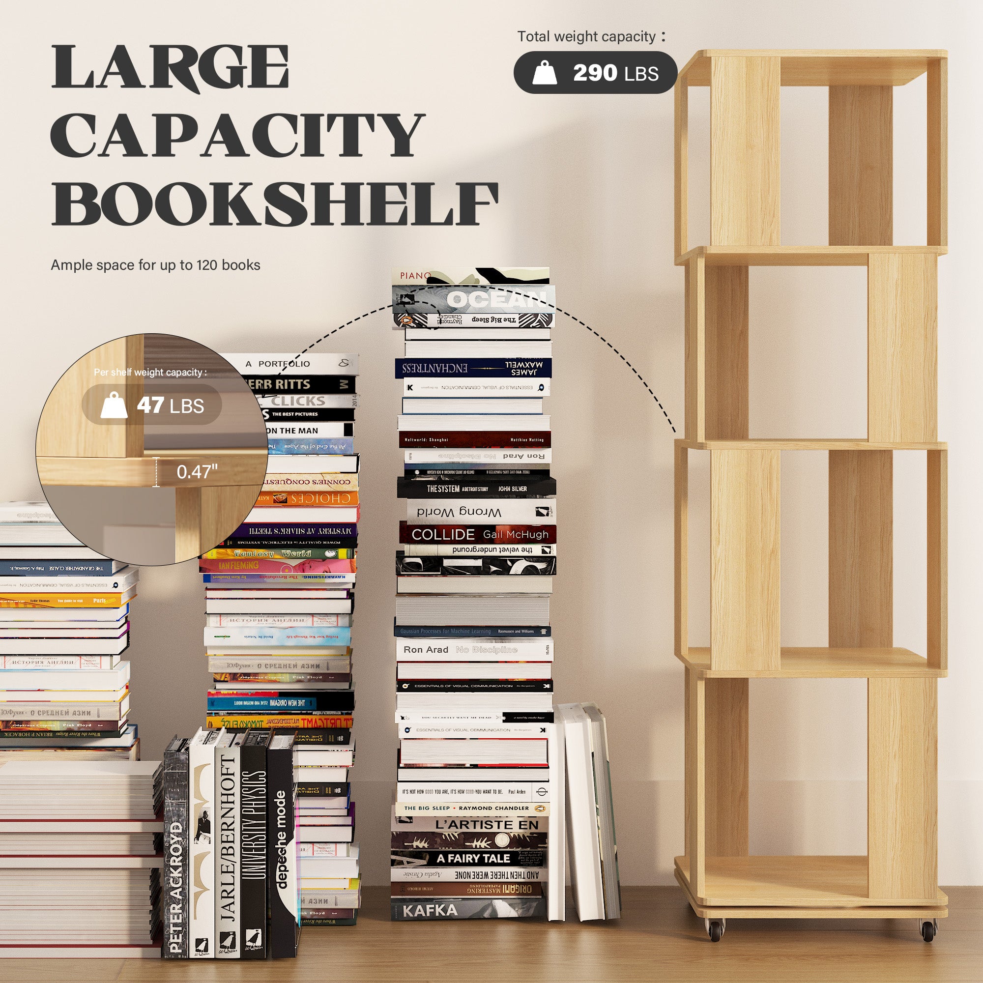 【Large Capacity & Space Saving】4-tier rotating bookshelf stands with 11.8" and 13.8" layer heights, 54.7" tall. The thickened 15.7"x15.7" base can holds different size of 100 books(about 25 books per shelf), stores decor or toys—practical and spacious