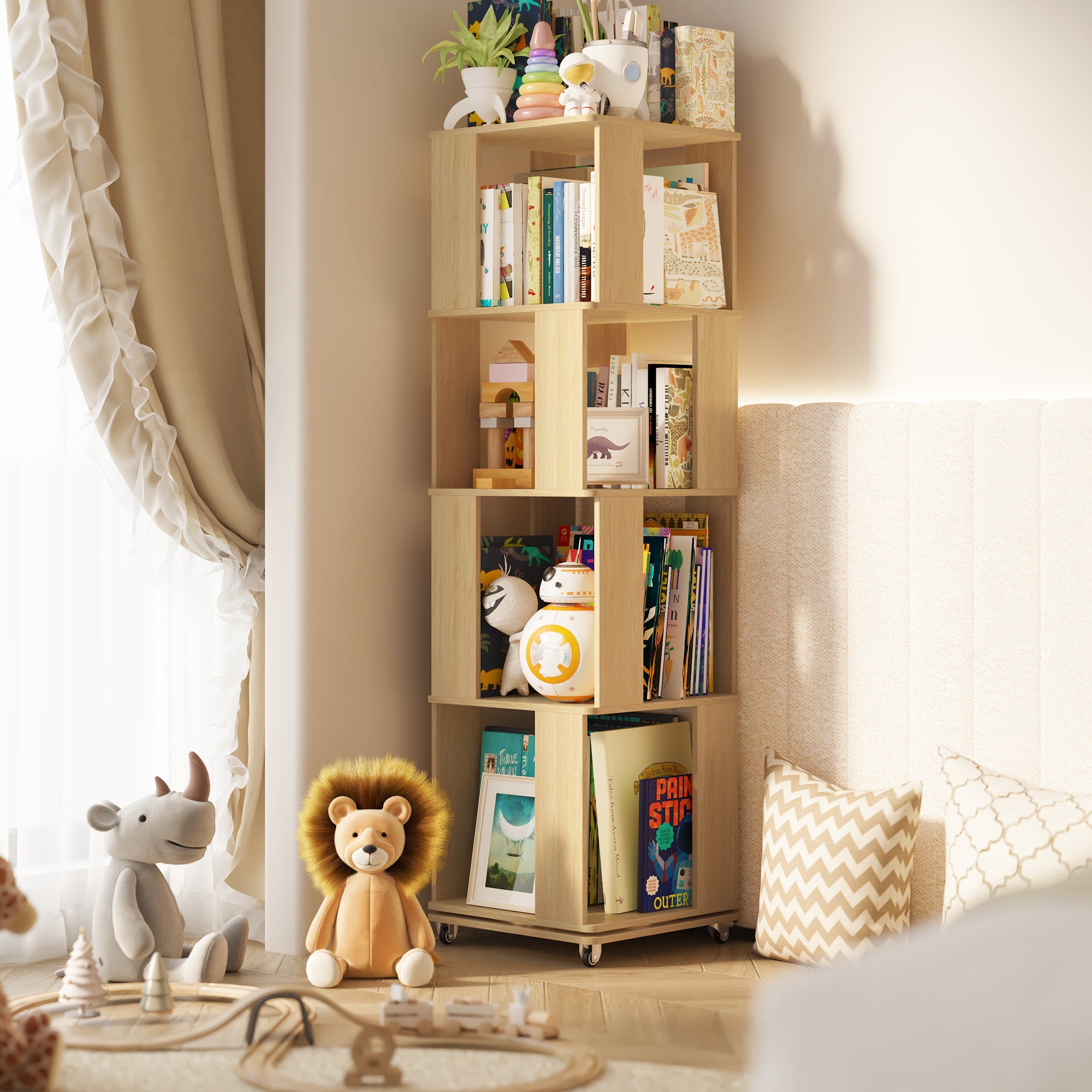 4 Tier Solid Wood Rotating Bookshelf Tower on Wheels, 360° Upgrade Spinning Book Shelf, Revolving Bookcase Organizer, Swivel Bookshelves for Small Spaces, Corner, Bedroom, Kids Room, Office (Natural)