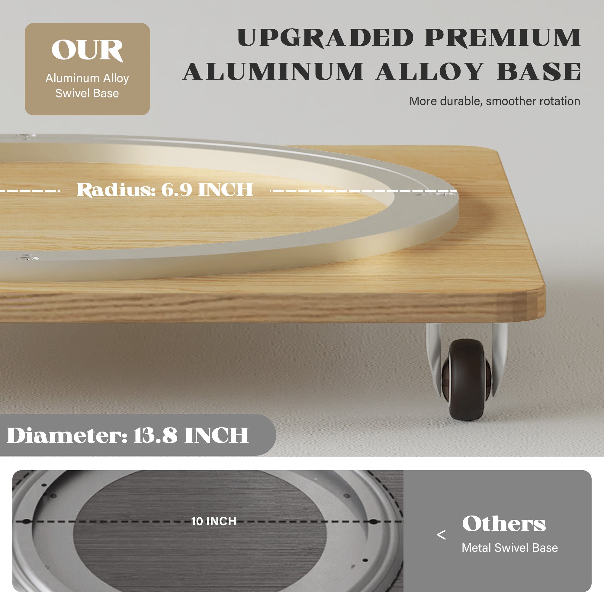 【Sturdy, Safe & Lockable Wheels】Reinforced 13.8" aluminum alloy turntable supports up to 290 lbs, 360°rotating book shelf with locking wheels provide firm stability, preventing tipping for ultimate safety in homes with kids or pets. This swivel bookshelf stands firm and flush to the ground without shaking when wheels are not installed